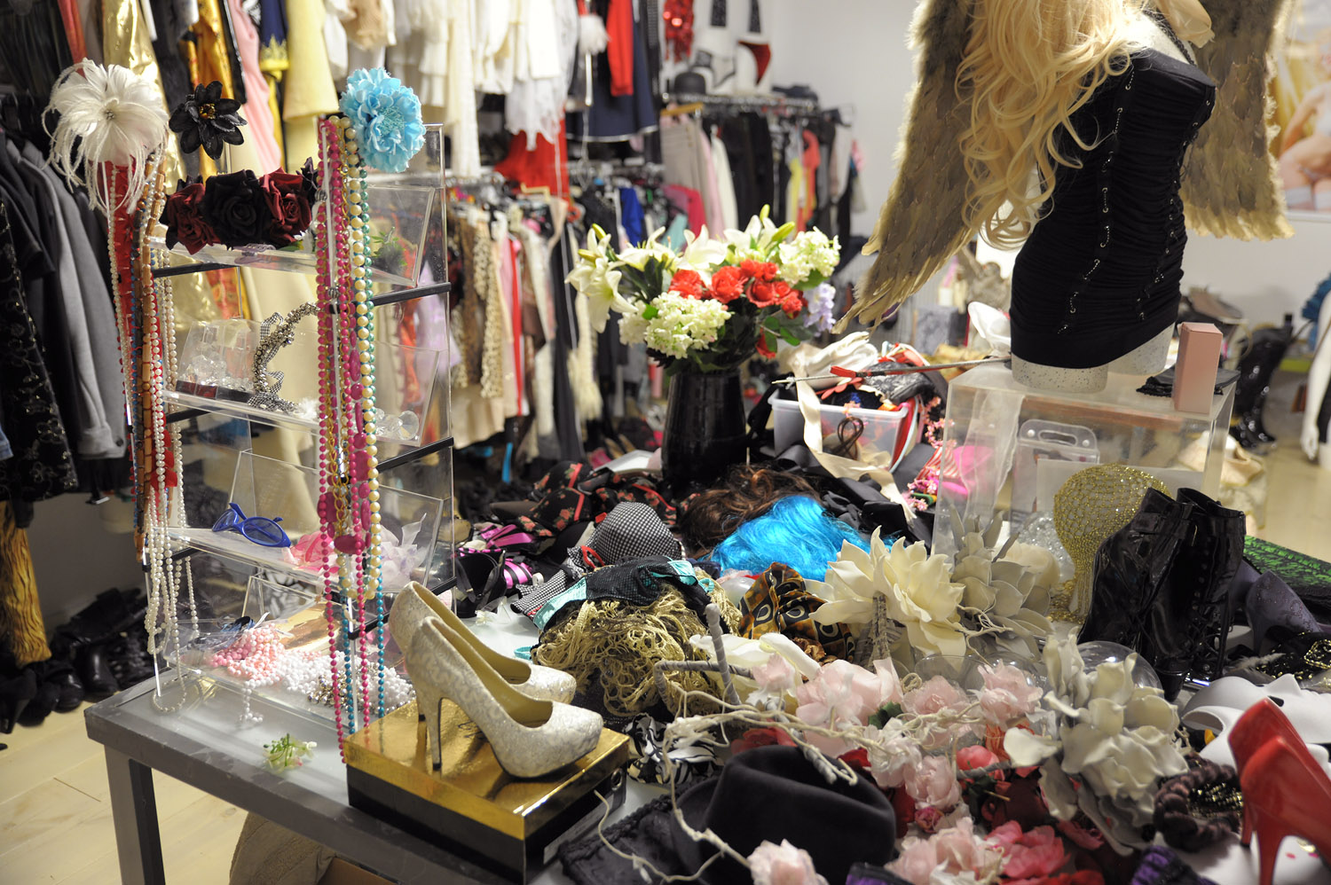 Op de verdieping is alles qua kleding en attributen verzameld. Hier is ook het koffiehoekje, keuken en badkamer.